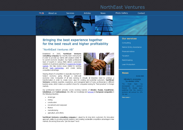 Consulting company «NorthEast Ventures» provides its services to companies operating or seeking to enter overseas markets. Employing experienced consultants from many countries that are experts in various fields, «NorthEast Ventures» offers financial counseling, search for business partners in different countries, consulting in the areas of taxation and lean production.