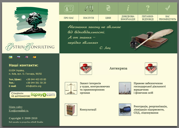 Law firm "Ostriv Consulting" specializes in complex legal support of businesses in the areas of economic, corporate, and tax legislation, and labor disputes settlement. The firm provides legal representation of clients in state executive bodies and courts, and offers such services as licensing, registration, reorganization, and liquidation of companies. Law firm "Ostriv Consulting" is located in Kyiv, Ukraine.