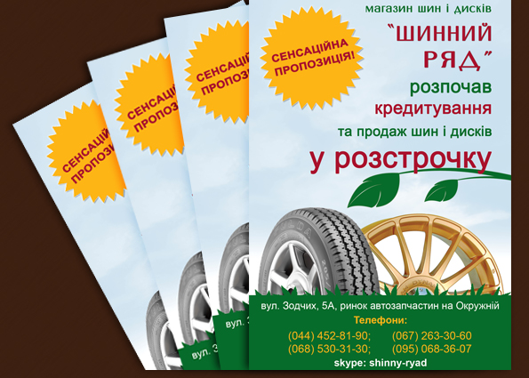 Our regular client, online store “Shinniy Ryad”, has recently made it possible for car owners to get a loan for purchasing tires and wheels. To help make this program a success we created these bright advertising flyers that serve the purpose of attracting more attention to the offer and ultimately increase its profitability. Everything, from an idea to layout and printing was made by our specialists. The flyer’s style is very similar to that of the online store in order to further increase brand recognition.