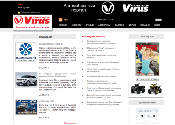 “Virus of Freedom” is a 4x4 automotive web portal containing an abundance of useful information: Ukrainian and world automotive news, sport news, articles about off-road vehicles, racing, auto travel, and technologies; the portal’s online store offers a wide selection of auto parts, goods, and accessories; there is a forum and a gallery; and online version of the popular auto magazine “Virus of Freedom”.