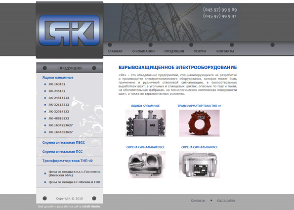 Considering the nature of the goods and target audience of the website, its design had to be simple and minimalistic while at the same time attractive and modern. To achieve this we used only a few decorative elements looking like the equipment details, and a photo emphasizing its connection to electric power. The company’s logo really stands out against a steel grey color palette and its metal texture resembles the surface of the equipment.