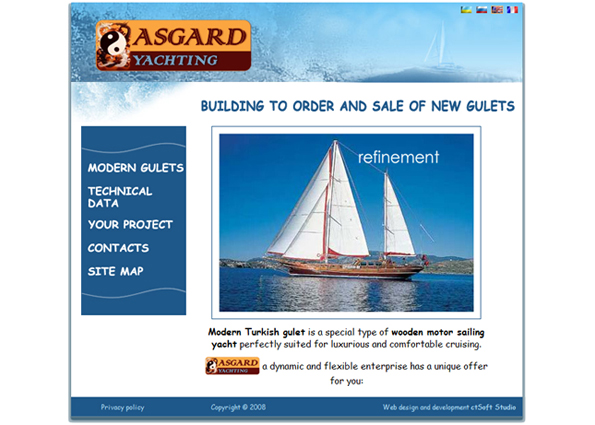 Розробка іміджевого веб-сайту для яхтобудівельної компанії «Asgard Yachting». Через цей сайт замовник прагнув передати атмосферу розкоші та комфорту виготовленої на замовлення яхти, надати відвідувачам відчуття подорожі по безкраїх морських просторах.