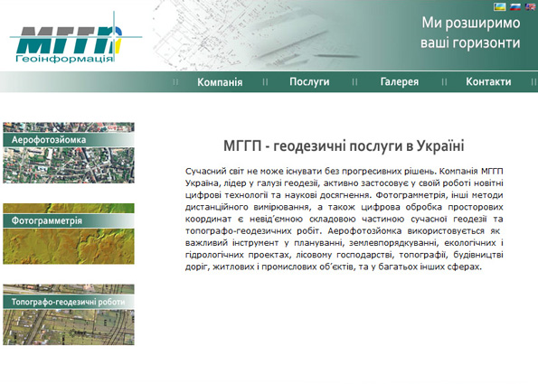Компанія МГГП Україна пропонує професійні рішення у різних галузях геодезії, топографії, аерофотозйомки і картографії. МГГП Україна використовує у своїй роботі сучасні технології й обладнання та співпрацює з відомими європейськими компаніями.