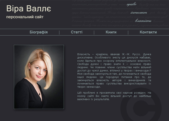 Персональний сайт Віри Валлє - юриста, автора статей і книг, присвячених питанням охорони авторського права, інтелектуальної власності та патентного права. На сайті ви знайдете статті та матеріали з книг «Інтелектуальна власність» і «Спадок Джеймса І та королеви Анни: охорона інтелектуальної власності у часі й просторі».